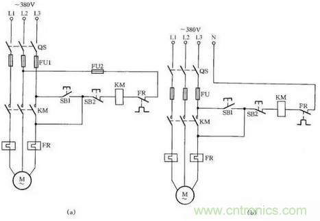 接觸器線圈電壓為380V時,可按圖12(a)所示接線;接觸器線圈電壓為220V時,可按圖12(b)接線。圖12(a)的接線還有缺陷,即在電動機停轉時,其引出線及電動機帶電,使維修不大安全。因此,這種線路只能在應急時采用,并在維修電動機時,應斷開控制電動機的總電源開關QS,這一點應特別注意。