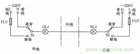 在某些生產(chǎn)過程中,需要兩地的生產(chǎn)人員能傳遞簡單的信息,以協(xié)調(diào)工作。圖22所示是用一根導(dǎo)線傳遞聯(lián)絡(luò)信號線路。兩地中各有一只雙擲開關(guān)控制信號燈聯(lián)絡(luò),信號燈分別裝在兩地,一地一個(gè)。當(dāng)甲地向乙地發(fā)聯(lián)絡(luò)信號時(shí),撥動(dòng)開關(guān)S1,乙地的指示燈亮,待乙地完成甲地所指示的任務(wù)后,乙地可把開關(guān)撥至“聯(lián)絡(luò)”位置,通知甲地工作已完成。