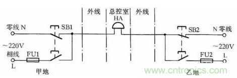 圖23所示線路可使甲乙兩地都能向總控制室發(fā)聯(lián)絡(luò)信號。當(dāng)甲地向總控制室發(fā)信號時(shí),按下按鈕SB1,控制室的電鈴告警。同理當(dāng)乙地向總控制室發(fā)信號時(shí)按下SB2即可。甲乙兩地信號可用信號鈴聲的時(shí)間長短或次數(shù)區(qū)分。