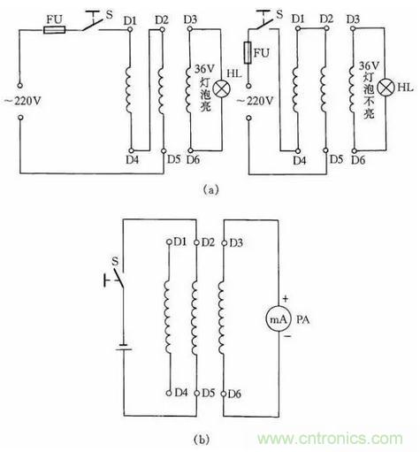 采用此法應(yīng)注意兩點(diǎn):一是在接線前必須把行燈變壓器次級一端與殼體的連接線(保護(hù)接地線)拆除;二是要注意行燈變壓器的初、次級繞組的電流都不能超過各自的額定電流值。