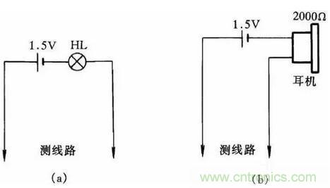 圖27(a)、(b)是最簡便的線路通斷檢測器。當(dāng)測得導(dǎo)線通路時(shí),燈泡會發(fā)光,耳機(jī)在通斷瞬時(shí)會發(fā)響;當(dāng)線路斷路時(shí),耳機(jī)不響,燈泡不亮。這種方法簡單易行,非常適合初學(xué)電工制作工具儀表或代替萬用表做測量,其優(yōu)點(diǎn)是攜帶方便。