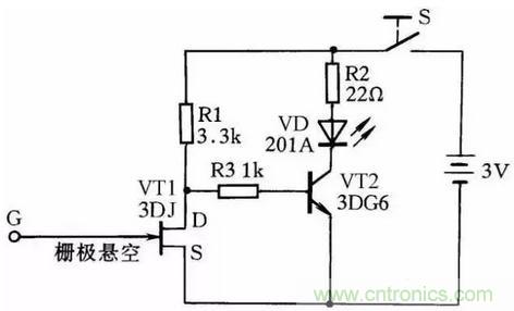 圖28所示是一感應(yīng)測電筆線路。它可方便地測出導(dǎo)線的斷芯位置。在用來測導(dǎo)線斷芯位置時(shí),在導(dǎo)線一端接上220V的電源相線,然后用感應(yīng)測電筆的探頭柵極靠近被測導(dǎo)線,并沿線移動(dòng)。如果發(fā)光二極管在移動(dòng)中突然熄滅,那么此處便是導(dǎo)線斷芯位置。