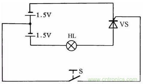 利用圖30所示的簡便方法可檢查晶閘管的好壞。當(dāng)開關(guān)S斷開時(shí)燈泡不亮,而當(dāng)開關(guān)S閉合后燈泡發(fā)亮,說明晶閘管能導(dǎo)通工作,否則晶閘管就是壞的。此方法對一般晶閘管均能測試,燈泡選用1.5V小電珠燈泡。