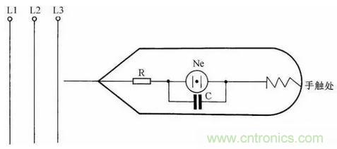 為了快速、準(zhǔn)確地判斷,可在一般的低壓驗(yàn)電筆的氖泡上并聯(lián)一只1500pF小電容,這樣在測強(qiáng)電時(shí),電筆照常發(fā)光。而測得的是感應(yīng)電時(shí),感應(yīng)電會通過電容再經(jīng)過人體被大地吸收掉,所以電筆不發(fā)光。在自制這種驗(yàn)電筆時(shí)應(yīng)把電筆上串聯(lián)的保護(hù)電阻放在測電筆線路的最前端以保障安全,見圖36。