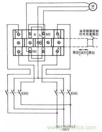 這里介紹一種常用限位器接線方法,這種限位器主要用于行車的上下電動(dòng)機(jī)限位。當(dāng)?shù)蹉^高于限制位置時(shí),它會使電動(dòng)機(jī)自動(dòng)斷開電源。這種方法一般是斷開主電機(jī)電源線,而不是用控制線控制接觸器通斷電動(dòng)機(jī)停止限位,其優(yōu)點(diǎn)是萬一接觸器觸點(diǎn)熔在一起不能斷開時(shí),限位器同樣能起到保護(hù)限位的作用。其接線方法如圖38所示。