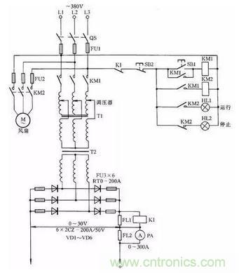 電路中VD1~VD4為4只硅整流二極管;R1~R4、C1~C4組成硅整流器件的過壓保護(hù)電路;FR為過流繼電器,保護(hù)硅整流器件。當(dāng)負(fù)載電流超過額定值時(shí),電流互感器次級電流相應(yīng)增加,帶動(dòng)繼電器FR動(dòng)作,F(xiàn)R常閉觸點(diǎn)打開,接觸器KM釋放,觸點(diǎn)打開切斷電焊機(jī)電源。硅整流器件用0.25kW風(fēng)扇作風(fēng)冷設(shè)備。圖中,C5為濾波電容,R5為泄放電阻。