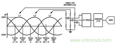 在此應(yīng)用中,Analog Devices 的 AD8436 RMS轉(zhuǎn)直流轉(zhuǎn)換器與3:1多路復(fù)用器配合使用,允許單個RMS轉(zhuǎn)直流轉(zhuǎn)換器監(jiān)視三相。使用三個1000:1高壓分壓器對相電壓進行采樣。
