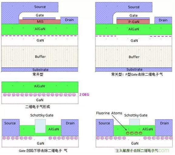 2、GaN和AlGaN異質(zhì)結(jié)內(nèi)在的產(chǎn)生導(dǎo)電的二維電子氣,常開型GaN器件通常稱為耗盡型GaN功率晶體管,必須在Gate加上反壓,才能將Gate下面AlGaN層中的二維電子氣去除,從而將器件關(guān)斷。這種常開型器件在應(yīng)用中會產(chǎn)生許多問題,因此不太適合實(shí)際的應(yīng)用。