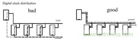 對應地線回路規則,實際上也是為了盡量減小信號的回路面積,多見于一些比較重要的信號,如時鐘信號,同步信號;對一些特別重要,頻率特別高的信號,應該考慮采用銅軸電纜屏蔽結構設計,即將所布的線上下左右用地線隔離,而且還要考慮好如何有效的讓屏蔽地與實際地平面有效結合。
