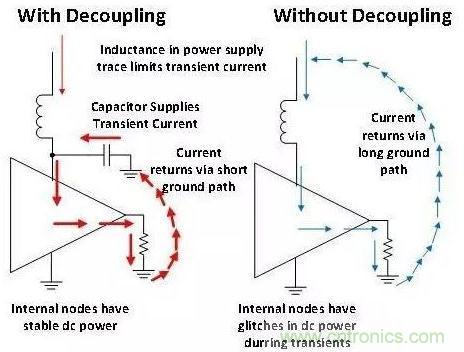 圖 2 闡述了為什么去耦非常重要。需要注意的是,電源線跡的電感將限制暫態(tài)電流。 去耦電容與器件非常接近,因此電流路徑的電感很小。在暫態(tài)過程中,該電容器可在非常短的時間內(nèi)向器件提供超大量的電流。 未采用去耦電容的器件無法提供暫態(tài)電流,因此放大器的內(nèi)部節(jié)點會下垂(通常稱為干擾)。無去耦電容的器件其內(nèi)部電源干擾會導(dǎo)致器件工作不連續(xù),原因是內(nèi)部節(jié)點未獲得正確的偏置。