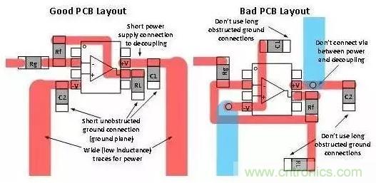 除了使用去耦電容器外,您還要在去耦電容器、電源和接地端之間采取較短的低阻抗連接。圖3將良好的去耦合板面布局與糟糕的布局進行了對比。您應(yīng)始終嘗試著讓去耦合連接保持較短的距離,同時避免在去耦合路徑中出現(xiàn)通孔,原因是通孔會增加電感。大部分產(chǎn)品說明書都會給出去耦合電容器的推薦值。如果沒有給出,則可以使用0.1uF。