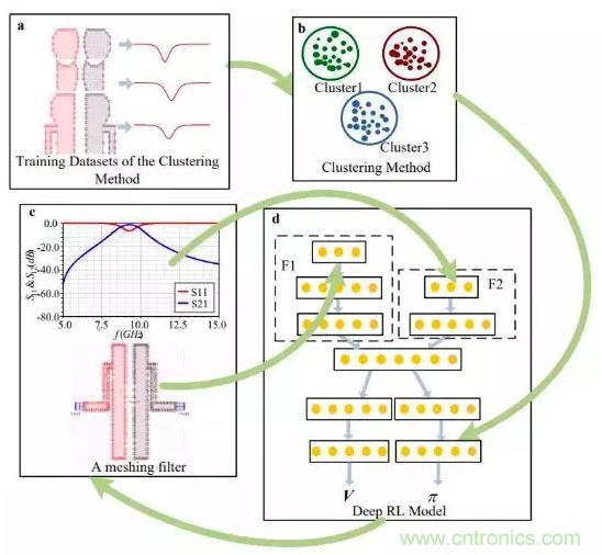 圖1:RINN架構(gòu)。a, 聚類算法的數(shù)據(jù)集,即網(wǎng)格模型的S參數(shù)變化矩陣。B,聚類算法。C、網(wǎng)格化的模型和S參數(shù)矩陣訓(xùn)練深度強(qiáng)化學(xué)習(xí)模型。d,以c為輸入,以動作的概率向量π和價值標(biāo)量v為輸出的深度強(qiáng)化學(xué)習(xí)模型。