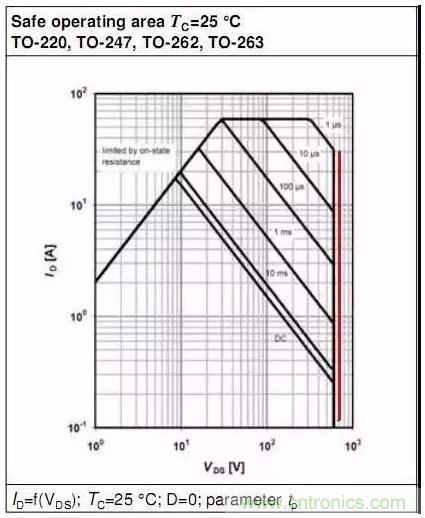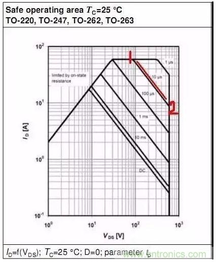 此圖中:當VDS=1V時,Y軸對應的ID為2A,Rds=VDS/ID=0.5R ==>Tj=150℃時,Rds(on)約為0.5R.當VDS=10V時,Y軸對應的ID為20A,Rds=VDS/ID=0.5R ==>Tj=150℃時,Rds(on)約為0.5R.所以,此部分曲線中,SOA表現為Tj_max時RDS(on)的限制.