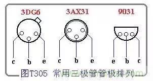 常用中小功率三極管有金屬圓殼和塑料封裝(半柱型)等外型,圖T305介紹了三種典型的外形和管極排列方式。