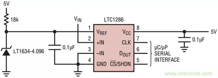 ADI提供的串聯(lián)產(chǎn)品包括LT1460、LT1790、LT1461、LT1021、LT1236、LT1027、LTC6652、LT6660等等。LT1021和LT1019等產(chǎn)品可以用作分流或串聯(lián)基準電壓源。串聯(lián)基準電壓源電路如圖4所示。