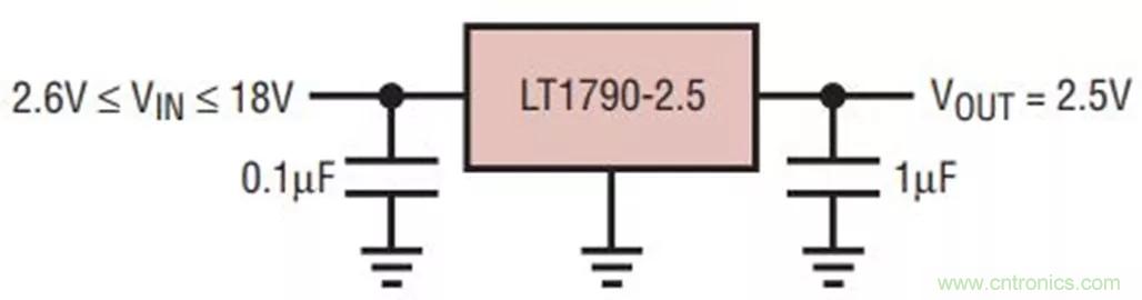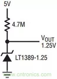 分流基準電壓源的有點包括:設計簡單,封裝小,在寬電流和負載條件下具有良好的穩(wěn)定性。此外,它很容易設計為負基準電壓源,并且可以配合非常高的電源電壓使用(因為外部電阻會分攤大部分電位),或配合非常低的電源電壓使用(因為輸出可以僅低于電源電壓幾毫伏)。ADI提供的分流產(chǎn)品包括 LT1004、LT1009、LT1389、LT1634、LM399 和 LTZ1000。典型分流電路如圖3所示。