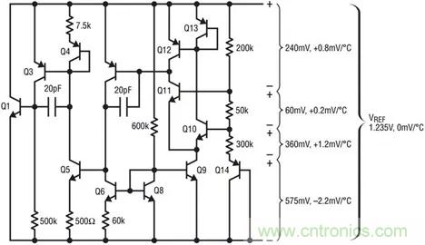 將此電壓施加到基極之間連接的50k電阻,產(chǎn)生一個與溫度成比例的電流。該電流偏置二極管Q14,25°C時其電壓為575mV,溫度系數(shù)為-2.2mV/°C。電阻用于產(chǎn)生具有正溫度系數(shù)的壓降,其施加到Q14二極管電壓上,從而產(chǎn)生大約1.235V的基準電壓電位,理論上溫度系數(shù)為0mV/°C。這些壓降如圖5所示。電路的平衡提供偏置電流和輸出驅(qū)動。