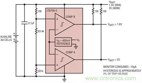 LT6700(圖7)和LT6703是集成度更高的解決方案,其將400mV基準電壓源與比較器相結(jié)合,可用作電壓監(jiān)控器或窗口比較器。400mV基準電壓源可以監(jiān)控小輸入信號,從而降低監(jiān)控電路的復雜性;它還能監(jiān)控采用非常低電源電壓工作的電路元件。如果閾值較大,可以添加一個簡單的電阻分壓器(圖8)。這些產(chǎn)品均采用小尺寸封裝(SOT23),功耗很低(低于 10μA),支持寬電源范圍 (1.4V 至 18V)。此外,LT6700 提供 2mm x 3mm DFN 封裝,LT6703 提供 2mm x 2mm DFN 封裝。
