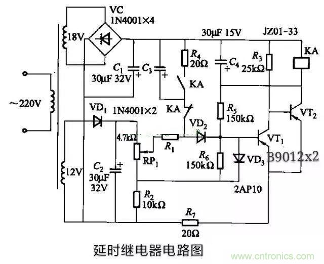 它工作使用一微型變壓器降壓,初級(jí)輸入電源為AC交流220Ⅴ,次級(jí)有二組電源AC18Ⅴ AC12Ⅴ,AC18V經(jīng)橋式整流二極管(1N4001×4),C1(30uf/32V)濾波后,為kA微型繼電器、復(fù)合三極管ⅤT1 ⅤT2(9012)提供直流DC工作電源。另一組AC交流12Ⅴ電經(jīng)vD1半波整流,C2電解電容濾波,供給調(diào)整充電時(shí)間專用可變電位器RP1,C3為一獨(dú)石電容,其工作特性較好而用于延時(shí)充放電電路中。圖中有JZ01一33繼電器的kA常開和一組kA常閉觸頭,它們?cè)陔娐分兄饕饔镁褪巧厦娼o大家說的,通電、斷電延時(shí)繼電器在完成預(yù)置時(shí)間后恢復(fù)原始狀態(tài),進(jìn)行下一步工作做好準(zhǔn)備。