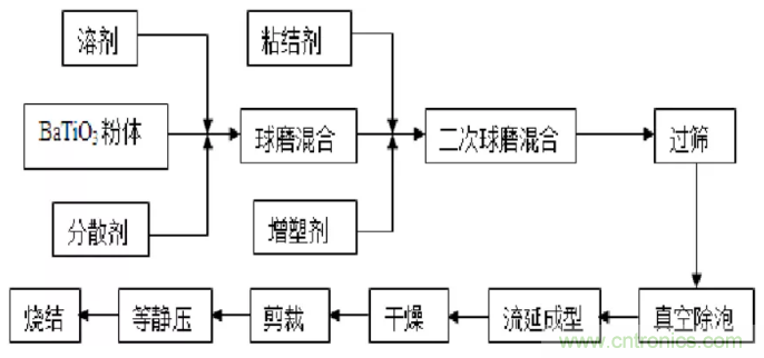 從圖3的工藝流程可以看出,MLCC的生產與陶瓷粉體息息相關,而其中涉及的包括電介質陶瓷瓷粉的制備、流延成膜陶瓷膜的薄膜化以及陶瓷粉料與金屬共同燒結技術,都將極大影響最終MLCC的品質。接下來我們簡要介紹這幾項技術。