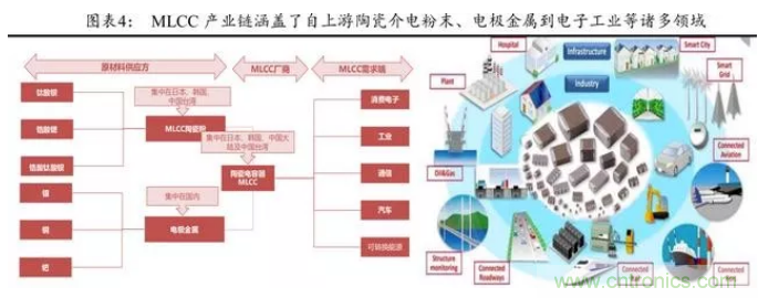 MLCC產業鏈涵蓋自上游陶瓷介電粉末、電極金屬至下游消費電子、工業等諸多領域。產業的上游主要涵蓋陶瓷粉末、電極金屬等,其中陶瓷粉末因其制備難度大,絕大部分市場份額被日韓供應商占有,銀、鎳等電極金屬則主要由國內廠商供應。