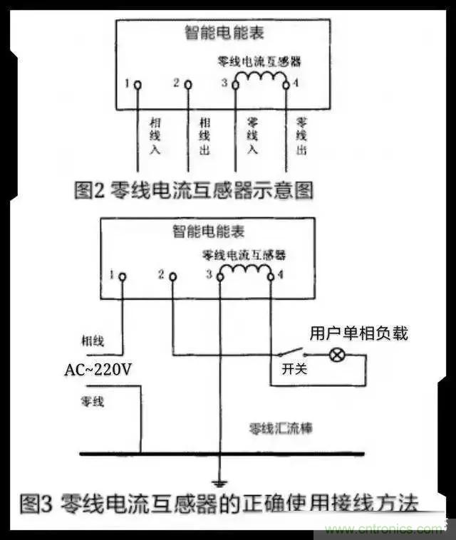 這種智能計(jì)量裝置采用微處理器和專門用于電能計(jì)量的芯片。它具有功能完善、計(jì)量精度高等等特點(diǎn)。而對(duì)于單相220V的用電用戶來說,現(xiàn)在的智能電能表在其內(nèi)部結(jié)構(gòu)中都已經(jīng)安裝了“零線電流互感器”。為了提高智能電能表的技術(shù)防護(hù)能力,在電源進(jìn)、出相線短接的情況下,它能夠檢測(cè)流過電能表的零線回路中的電流。而且國家電網(wǎng)在技術(shù)規(guī)范要求中明確提出,所有的智能電能表都必須安裝有零線電流互感器測(cè)量、記錄的功能。請(qǐng)看下圖所示