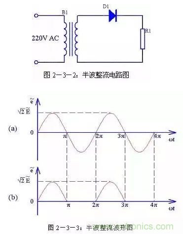 半波整流電路見圖2-3-2。其中B1是電源變壓器,D1是整流二極管,R1是負(fù)載。B1次級是一個方向和大小隨時間變化的正弦波電壓,波形如圖 2-3-3(a)所示。0~π期間是這個電壓的正半周,這時B1次級上端為正下端為負(fù),二極管D1正向?qū)ǎ娫措妷杭拥截?fù)載R1上,負(fù)載R1中有電流通過;π~2π期間是這個電壓的負(fù)半周,這時B1次級上端為負(fù)下端為正,二極管D1反向截止,沒有電壓加到負(fù)載R1上,負(fù)載R1中沒有電流通過。在 2π~3π、3π~4π等后續(xù)周期中重復(fù)上述過程,這樣電源負(fù)半周的波形被“削”掉,得到一個單一方向的電壓,波形如圖2-3-3(b)所示。由于這樣得到的電壓波形大小還是隨時間變化,我們稱其為脈動直流。