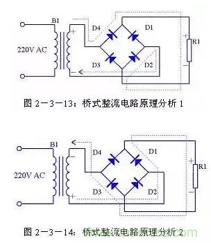 由圖2-3-13可以看出在電源正半周時,B1次級上端為正,下端為負(fù),整流二極管D4和D2導(dǎo)通,電流由變壓器B1次級上端經(jīng)過D4、R1、D2回到變壓器B1次級下端;由圖2-3-14可以看出在電源負(fù)半周時,B1次級下端為正,上端為負(fù),整流二極管D1和D3導(dǎo)通,電流由變壓器B1次級下端經(jīng)過 D1、R1、D3回到變壓器B1次級上端。R1兩端的電壓始終是上正下負(fù),其波形與全波整流時一致。