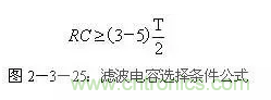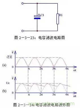 電容濾波電路圖見圖2-3-23,電容濾波電路是利用電容的充放電原理達(dá)到濾波的作用。在脈動直流波形的上升段,電容C1充電,由于充電時間常數(shù)很小,所以充電速度很快;在脈動直流波形的下降段,電容C1放電,由于放電時間常數(shù)很大,所以放電速度很慢。在C1還沒有完全放電時再次開始進(jìn)行充電。這樣通過電容C1的反復(fù)充放電實現(xiàn)了濾波作用。濾波電容C1兩端的電壓波形見圖2-3-24(b)。