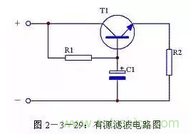 當(dāng)對濾波效果要求較高時,可以通過增加濾波電容的容量來提高濾波效果。但是受電容體積限制,又不可能無限制增大濾波電容的容量,這時可以使用有源濾波電路。其電路形式見圖2-3-29,其中電阻R1是三極管T1的基極偏流電阻,電容C1是三極管T1的基極濾波電容,電阻R2是負(fù)載。這個電路實際上是通過三極管T1的放大作用,將C1的容量放大β倍,即相當(dāng)于接入一個(β+1)C1的電容進(jìn)行濾波。