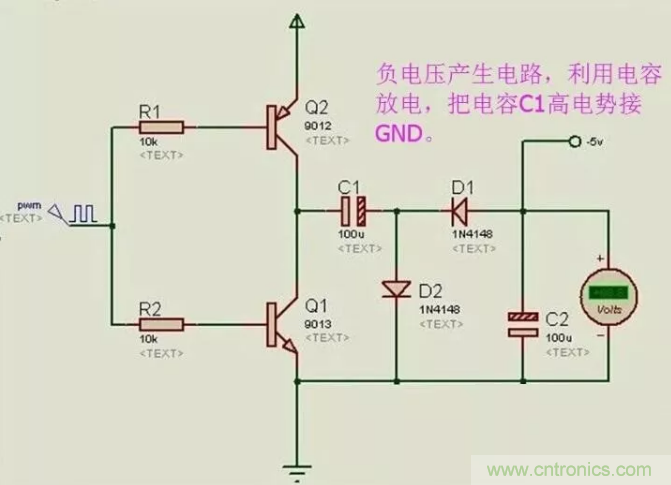 一個(gè)負(fù)電壓產(chǎn)生電路:利用電容充電等效出一個(gè)新電源,電容串聯(lián)在GND后,等效為電源2。則產(chǎn)生負(fù)電壓。