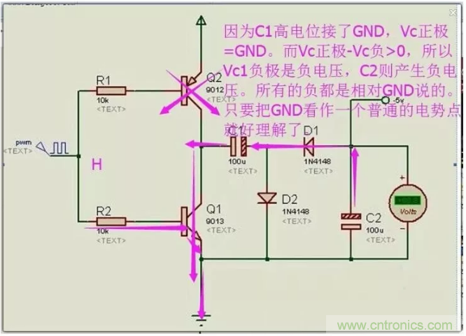 3、電容C1作為電源,C1高電勢極串聯(lián)在參考點(diǎn)。C1放電,從C2續(xù)流,產(chǎn)生負(fù)電壓。