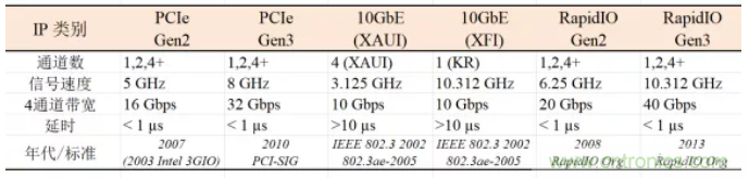物聯網和5G聯網通信中除了信號收發單元(transceiver, TRX 以及TX/RX)設計芯片之外,離不開專用的系統芯片SoC,其中高性能與高速核心IP往往決定了SoC的性能和速度。常見的高性能與高速核心IP有: PCIe, 10 Gigabit Ethernet (10 GbE), RapidIO, SerDes, USB等。表1列出了幾種物聯網和5G時代常用的高性能與高速IP的信號速度和數據率。