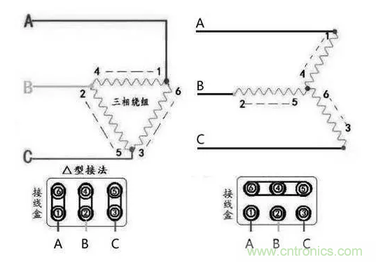 星型就是三個繞組的尾端連到一起,三角形是三個繞組首尾連接