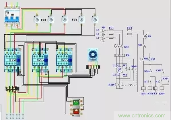 從上圖我們可以看出,剛開始1號接觸器和3號接觸器同時吸合,由于三號接觸器上端是短接到一起的,三個點接為一點,這一個點連接電機的W2,U2,V2,正好是星型接法,這個點叫中性點。星型啟動降低了電壓,減小了電流,電機啟動很輕松。當啟動以后,3號接觸器斷開,2號接觸器吸合,1號是主電源接觸器,一直保持吸合狀態。1號接觸器和2號接觸器吸合以后,電機的三個繞組就成了三角形接法,電機就可以全電壓正常運行。