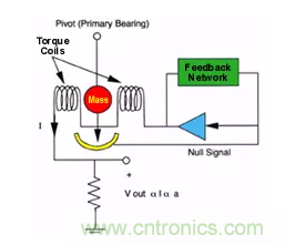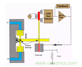 如果對這個組件施加加速度,就會對質量施加一個力,它將試圖從零位置移動。當零檢測器檢測到運動時,通過伺服放大器增加線圈電流以保持零位置。
