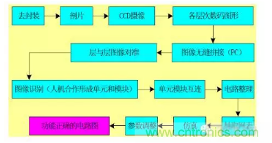 用大俗話來說,找一塊有用的芯片,照照相、制制版、提提圖、畫畫圖、仿仿真,芯片電路就反求了出來;編編工藝、設計工裝、將生產線開動,芯片又做了出來;再做做測試、進行老化,芯片就可以上市了。這就是集成電路反向開發的各道工序、完整流程。下面這張圖就說明了全過程。