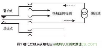 觸點接觸電阻包括動合點接觸電阻和靜合點接觸電阻,是繼電器最重要的參數之一,也是最難測的參數的之一。圖3顯示了對繼電器觸點進行四線凱爾文測試的原理。說其難測是因為接觸電阻只有幾十毫歐、十幾毫歐,甚至只有幾毫歐,如果不是全線采取四線凱爾文測試,扣除測試系統的內部電阻和接觸電阻則很難將其測準。說其重要是因為觸點接觸電阻除了反映觸點的電性能(電阻)以外,還反映了觸點的化學和物理性能,例如觸點表面是否有鈍化膜產生,觸點間的壓力是否能達到設計要求。試驗證明當繼電器中的彈性材料應力減退,觸點壓力下降將會在觸點接觸電阻參數上有明顯的反映,所以觸點接觸電阻與繼電器的接觸可靠性密切相關。表2顯示了繼電器樣品在試驗中觸點接觸電阻和觸點壓力之間的關系。