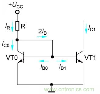 如圖1所示為鏡像恒流源電路,它由兩只特性完全相同的管子VT0和VT1構成,由于VT0管的c、b極連接,因此UCE0=UBE0,即VT0處于放大狀態,集電極電流IC0=β0*IB0。另外,管子VT0和VT1的b-e分別連接,所以它們的基極電流IB0=IB1=IB。設電流放大系數β0=β1=β,則兩管集電極電流IC0=IC1=IC=β*IB。可見,由于電路的這種特殊接法,使兩管集電極IC1和IC0呈鏡像關系,故稱此電路為鏡像恒流源(IR為基準電流,IC1為輸出電流)。