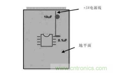 在布線時(shí),模擬器件和數(shù)字器件都需要這些類型的電容,都需要靠近其電源引腳連接一個(gè)電容,此電容值通常為0.1uF。系統(tǒng)供電電源側(cè)需要另一類電容,通常此電容值大約為10uF。