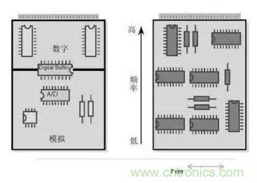 圖4 (左)將數(shù)字開關(guān)動(dòng)作和模擬電路隔離,將電路的數(shù)字和模擬部分分開。(右)要盡可能將高頻和低頻分開,高頻元件要靠近電路板的接插件。