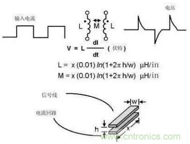 流經(jīng)電路板走線的開關(guān)電流將引起電壓發(fā)生變化,電路板走線存在寄生電感,可采用如下公式計(jì)算電壓的變化:V = LdI/dt。其中:V = 電壓的變化,L = 電路板走線感抗,dI = 流經(jīng)走線的電流變化,dt =電流變化的時(shí)間。