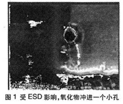 如圖1所示,電子部件受ESD影響時,會發(fā)生什么?會產(chǎn)生一個細(xì)微的孔,氧化物將侵?jǐn)_部件。