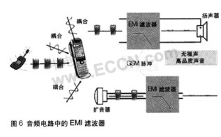 在音頻電路中如有電磁干擾(EMI),會出現(xiàn)嘶嘶、噼啪、嗡嗡等聲音,聲音質(zhì)量很差。手機(jī)用戶無法忍受這樣的干擾。因此,必須設(shè)法過濾音頻電路的電磁干擾。