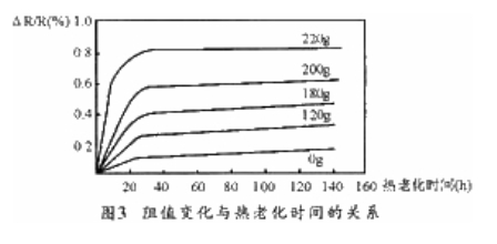 圖3所示為卡瑪線在不同拉力下繞制后,在190℃溫度熱老化過程中阻值隨時間的變化曲線。拉力越大,阻值在熱老化時的變化也越大,這說明熱處理是消除應力影響的有效措施。