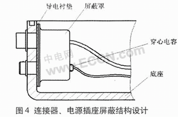 終端的通信連接器及電源輸入插座安裝在底座側(cè)面,需要在側(cè)面開口。為防止在開口處形成電磁泄露,可以在這些元件的后面裝屏蔽罩,穿過屏蔽罩的引線加裝穿心電容,焊接時(shí)引線通過穿心電容穿過屏蔽罩與元件相連。對(duì)于引入的電源插座,采用穿心電容實(shí)現(xiàn)電磁屏蔽。