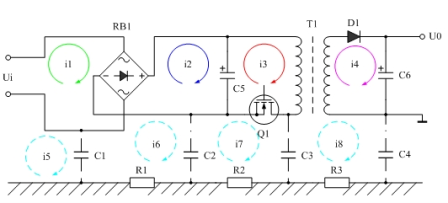 另外,還有4個回路電流i5、i6、i7、i8,這四個回路電流一般人是不會太注意的。這四個電流與前面的3個電流i1、i2、i3基本沒有直接聯系,它們都是通過電磁感應(電場與磁場感應)產生的。在這幾個電流中,其中以i7最嚴重,因為,變壓器初級線圈產生的反電動勢一端正好通過C3與大地相連,另一端經過其它3個回路與交流輸入回路相連。