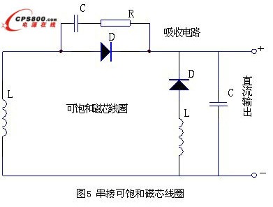 二次整流回路中,與整流二極管D串接可飽和磁芯的線圈,如圖5所示。可飽和磁芯線圈在通過正常電流時磁芯飽和,電感量很小,不會影響電路正常上作。一旦電流要反向時,磁芯線圈將產(chǎn)生很大的反電動勢,阻止反向電流的上升。因此,將它與二極管D串聯(lián)就能有效地抑制二極管D的反向浪涌電流。