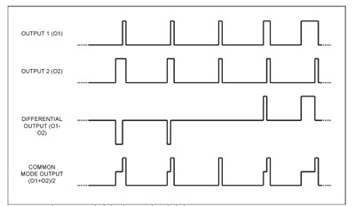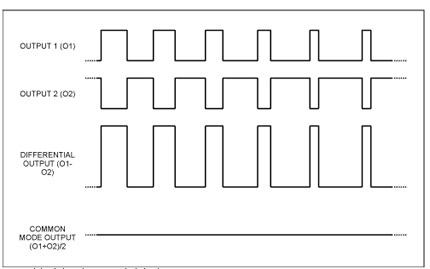 如圖1所示,如果器件的反相和同相輸出回路具有較高的匹配度,則兩個(gè)對(duì)稱(chēng)輸出信號(hào)波形在揚(yáng)聲器或連線(xiàn)上將具有很小的共模(CM)信號(hào)(底部的跡線(xiàn))。注意:50%占空比代表零輸入信號(hào)(空閑狀態(tài))。因此,可以設(shè)計(jì)一個(gè)差分低通濾波器,用于衰減信號(hào)波形中高頻分量(快速切換所產(chǎn)生的),同時(shí)保留有用的低頻分量以輸出到揚(yáng)聲器。