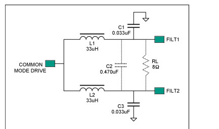 此類(lèi)D類(lèi)放大器對(duì)輸出濾波器的要求,不同于具有傳統(tǒng)差分輸入和互補(bǔ)PWM輸出的放大器。與PWM相比,MAX9704調(diào)制方案的輸出往往含有較高的共模信號(hào),設(shè)計(jì)輸出濾波器時(shí)需要考慮這點(diǎn)。正如后面的實(shí)例所示,傳統(tǒng)差分濾波器拓?fù)浣Y(jié)構(gòu)的效果往往不太理想。